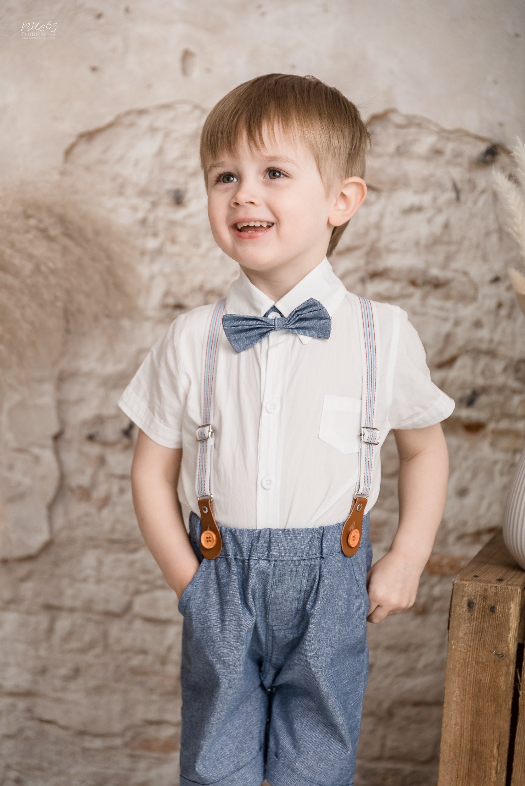 Tolles Outfit bestehend aus einem Hemdbody in creme, kurzer Hose, Hosenträgern und kleiner abnehmbarer Fliege. Wahlweise in grün oder blau und in unterschiedlichen Größen.