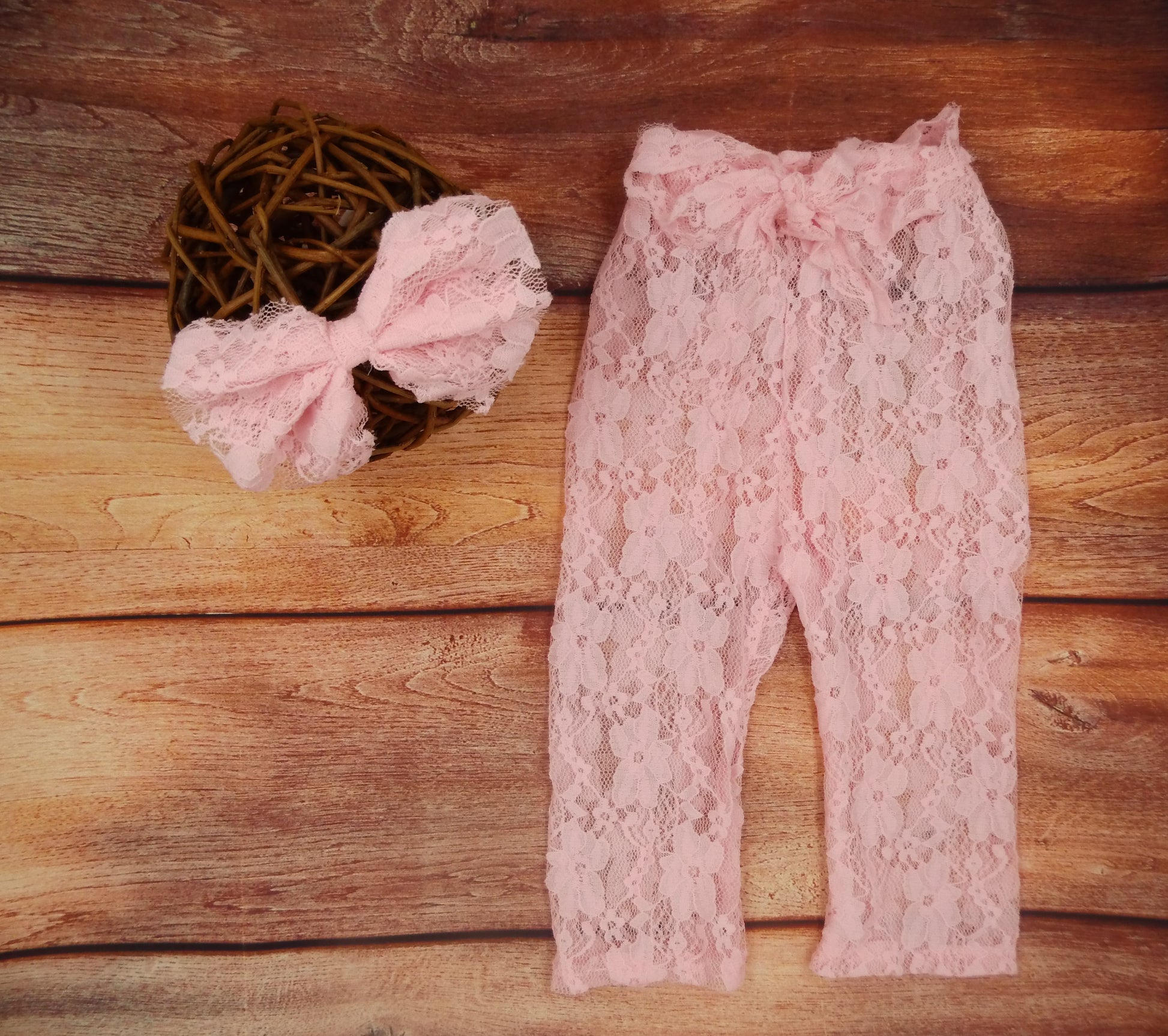 Wunderschönes Outfit bestehend aus Spitzenhose und Stirnband in weiß und rosa.
